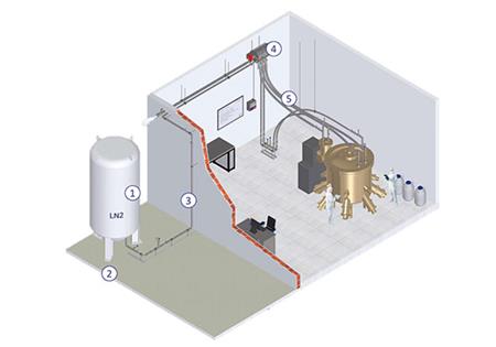 整套系統(tǒng)配套有通風(fēng)系統(tǒng),以保證冷凍罐內(nèi)維持微負(fù)壓,防止氮?dú)庖莩龅街車h(huán)境中。